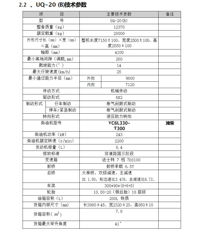 UQ-20(B) 是一种以柴油机为动力、机械传动、后轮驱动的非煤矿井下无轨式运输机械,主要用于巷道断面不小于 4×3m、坡度不大于 14°的非煤矿井下运输作业。 2.1、主要技术特点 1)、该车为重卡底盘,正向驾驶,转向半径小。 2)该车采用玉柴非道路国三柴油机,、后轮驱动、液压助力转向、爬坡能力强、转 向灵活。